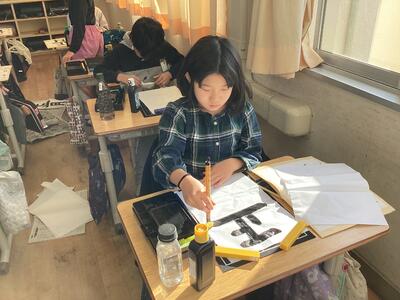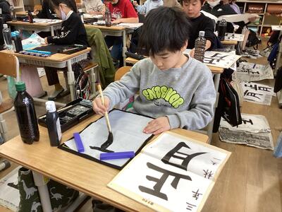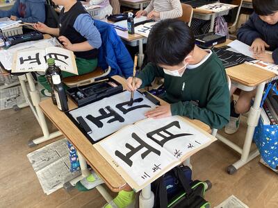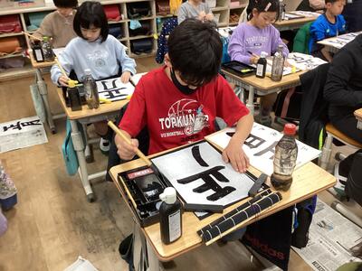 書いた文字は「正月」。静かな雰囲気で、集中して取り組みました。