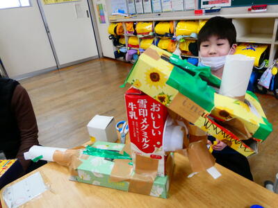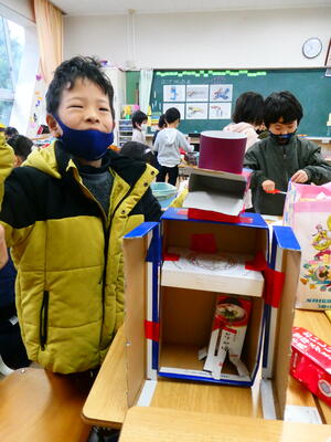 1年生は図画工作科で「はこでつくったよ」という単元の学習をしました。この学習では、様々な箱の大きさや形をうまく活用して、切ったり、組み合わせたりして作品を作りました。子どもたちはそれぞれ、動物や家、車など様々なテーマを決め、工夫して楽しそうに取り組んでいました。