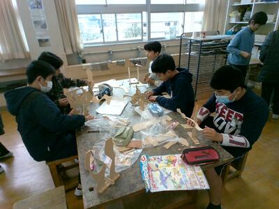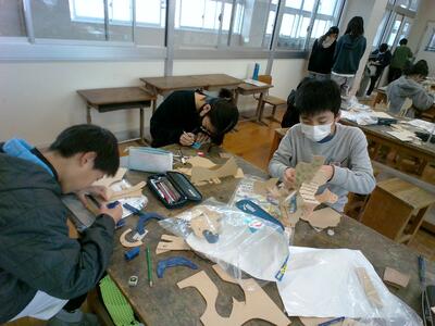グループで活動したこともあり、友達の作品からヒントを得たり、時には手伝ってもらったりしながら制作するようすが見られ、和気あいあいとした空気に包まれていました。