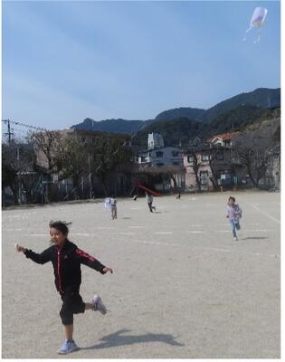 1年生は14日(木)に生活科のふゆあそびの1つとして、凧あげを行いました。