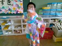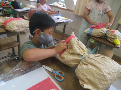 2年生は初めてのホッチキスに苦戦しながらもかっこいい衣装を作ることができました。3年生はいろんな色の紙を入れた袋を結び、自分だけのお友だちをつくることができました。