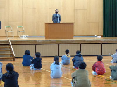 時津小学校では、始業式・終業式を、体育館で参加する学年、教室でオンラインで参加する学年に分ける「ハイブリッド方式」で行っています。現在の感染状況を見て、今回は代表学級のみでしたが、体育館にも子どもたちが参加して始業式を行うことができました。3学期は、時津町一挨拶のできる学校をみんなでめざします。