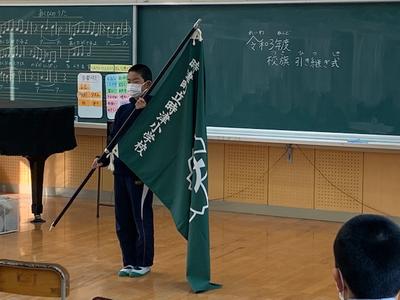 3月9日(水)朝、校旗とJRC旗の引継ぎ式を行いました。感染状況を考慮し、5・6年生代表で引継ぎ式を行い、各学級で中継を参観する形で行いました。6年生と5年生の間で、「託す」「受け取る」という決意が伝わる会でした。引き継いだのは「旗」だけでなく「思い」や「伝統」です。